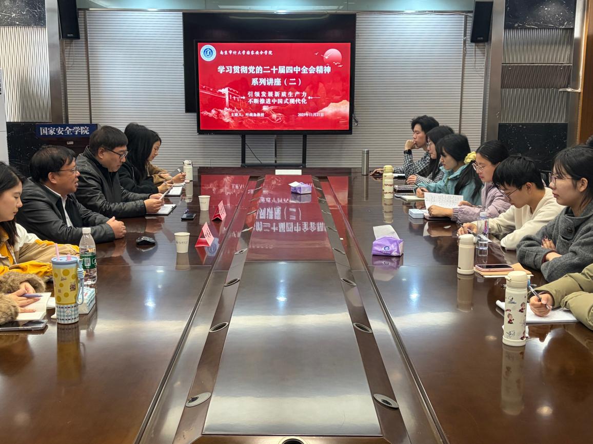 为进一步学习贯彻党的二十届四中全会精神,2025年11月21日上午,国家安全学院举办题为《引领发展新质生产力,不断推进中国式现代化》讲座,本次讲座由叶战备教授主讲、汪建昌教授主持,学院30余名研究生现场聆听学习,共同深化对全会精神与核心议题的理解。