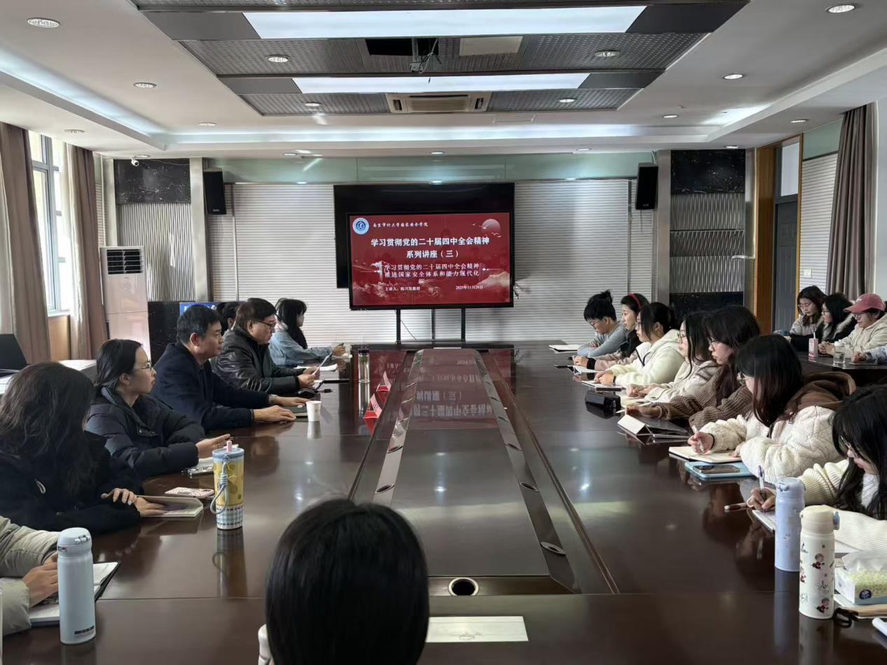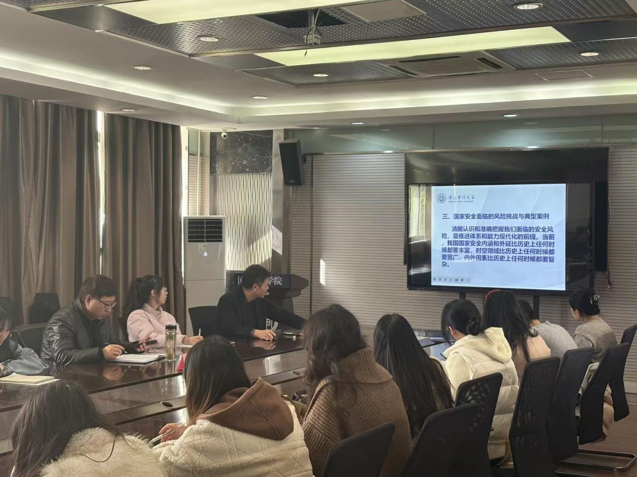 为深入学习领会党的二十届四中全会精神的丰富内涵与核心要义,2025年11月28日上午,国家安全学院在竞慧东302会议室举办了题为《学习贯彻党的二十届四中全会精神,推进国家安全体系和能力现代化》的讲座。本次讲座由陈兴发教授主讲、汪建昌教授主持,学院30余名研究生、本科生现场聆听学习。